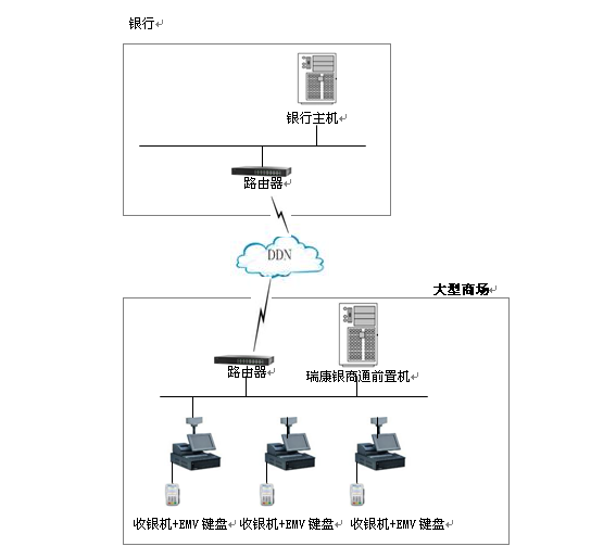 在本方案中通過在商戶收銀機(jī)上外接EMV密碼鍵盤或POS即可實(shí)現(xiàn)銀行卡受理,交易由商戶收銀系統(tǒng)發(fā)起,在EMV鍵盤或POS上完成銀行卡收單交易數(shù)據(jù)的采集,通過商戶內(nèi)部網(wǎng)絡(luò)經(jīng)由商戶與銀行的專線將銀行卡交易數(shù)據(jù)上送銀行處理,銀行處理完成后將交易數(shù)據(jù)返回到EMV鍵盤或POS終端,終端將把交易的結(jié)果反饋給商戶收銀系統(tǒng)完成交易。